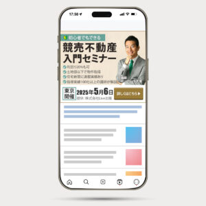 競売不動産バナー 2025年10月23日 最終更新日時 : 2025年10月27日 hibiki design 競売不動産バナー(3案制作)_制作時期2025年7月_目的新規の方向け広告用バナー_ターゲット競売不動産に興味がある 40-50代男性_制作のポイント不動産を扱うセミナーなので、落ち着いた色味やイラストを使い信頼感のある印象を出し、開催日時が一目でわかるよう心がけました。 \ 最新情報をチェック /
