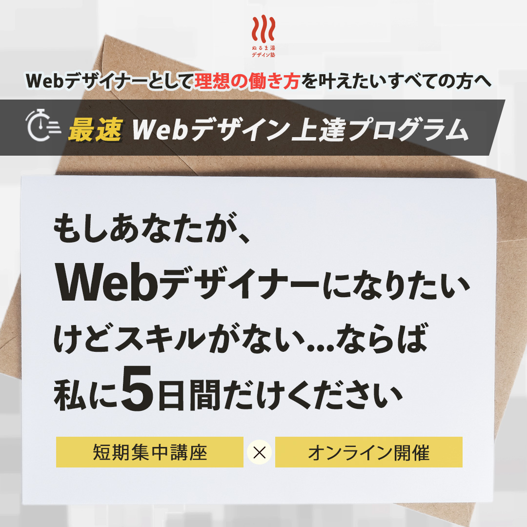 デザインスクール5日間チャレンジバナー 2026年1月31日 最終更新日時 : 2026年2月21日 hibiki design WEBデザイン5日間チャレンジプログラムバナー◾️制作時期2025年11月◾️目的無料のWEBデザイン5日間チャレンジに参加してもらい、参加後に講座案内LPへ誘導すること。Facebook、Instagramの広告などで使用。◾️制作のポイントLPに遷移した時に雰囲気が変わらないよう、基本的にはLPのフォントやカラーを活かしたデザインにしました。講師からのお手紙風メッセージというイメージで作成しました。